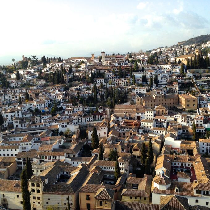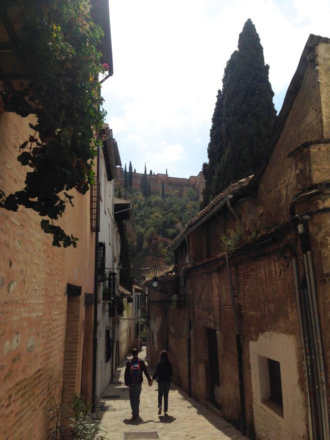 This past week, Mr. Dame in Spain and I motored down south to meet up with visiting family. (We didn’t manage to escape the gray drizzle that seems to have blanketed all of Spain for the past week). We arrived very late at night, GPS was no help at all, and I was not a happy camper pulling my well-worn, three-wheeled suitcase through the steep cobbled streets searching for our AirBnB apartment. But I was immediately charmed by Granada: the treacherous-but-beautiful cobblestone streets, the friendly stray cats, and the Alhambra glowing in the very near distance. We finally found our apartment and guzzled down an Alhambra beer.