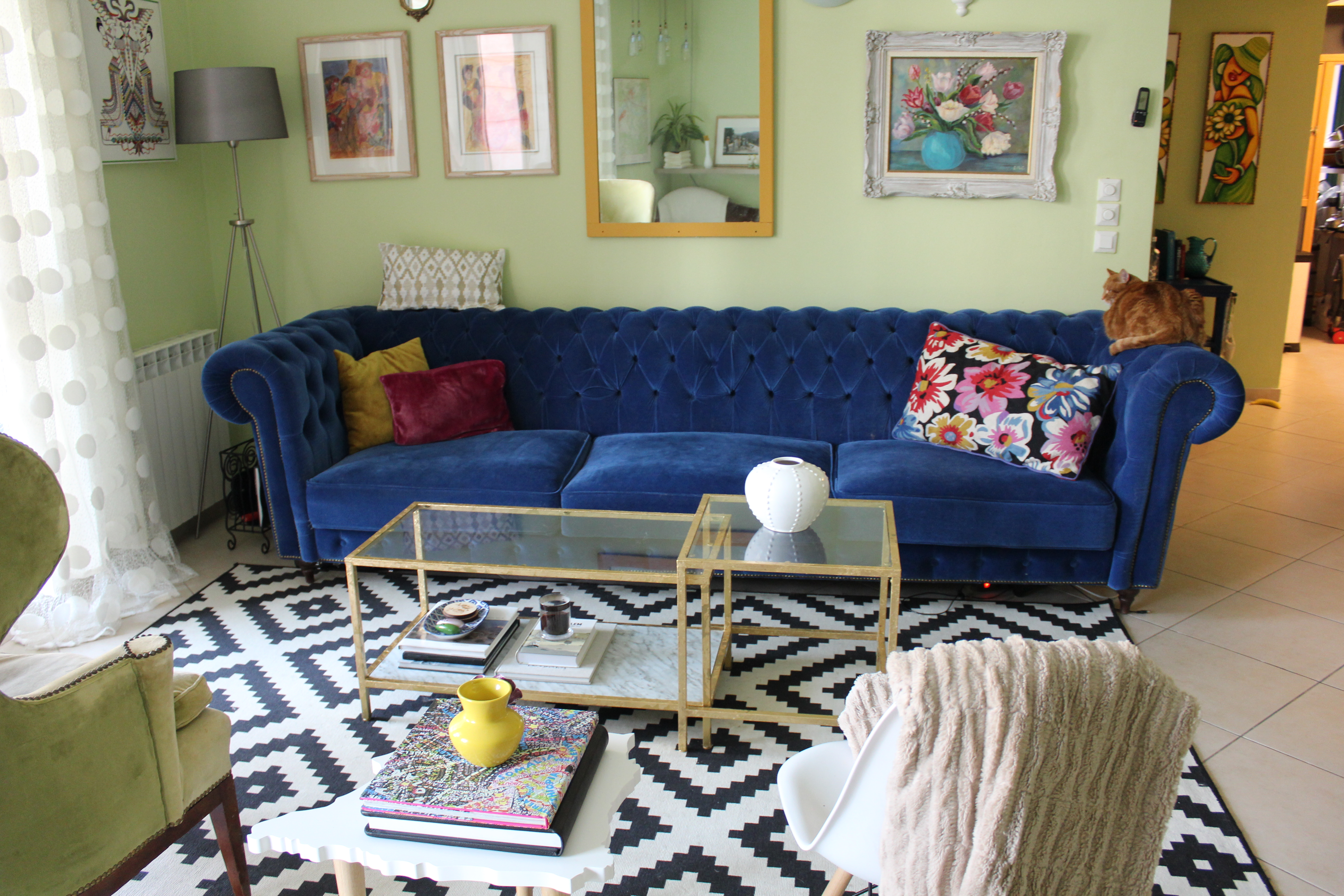 Before we left Madrid, we gave away my old couch, the one I’d had since college. The one on which my neighbor may or may not have expired. Back in 2004, Mom recovered it in an off-white canvas and it served me well for more than a decade as comfy, cute, but not particularly sophisticated couch for years. But I was ready for a sofa. And I knew just what I wanted: A elegant, dark blue, velvet Chesterfield. A piece of furniture that one would look regal upon whilst draped in green silk, sipping champagne, but also the kind of sofa that would up the elegance of a Netflix-and-cheese binge by a million percent.