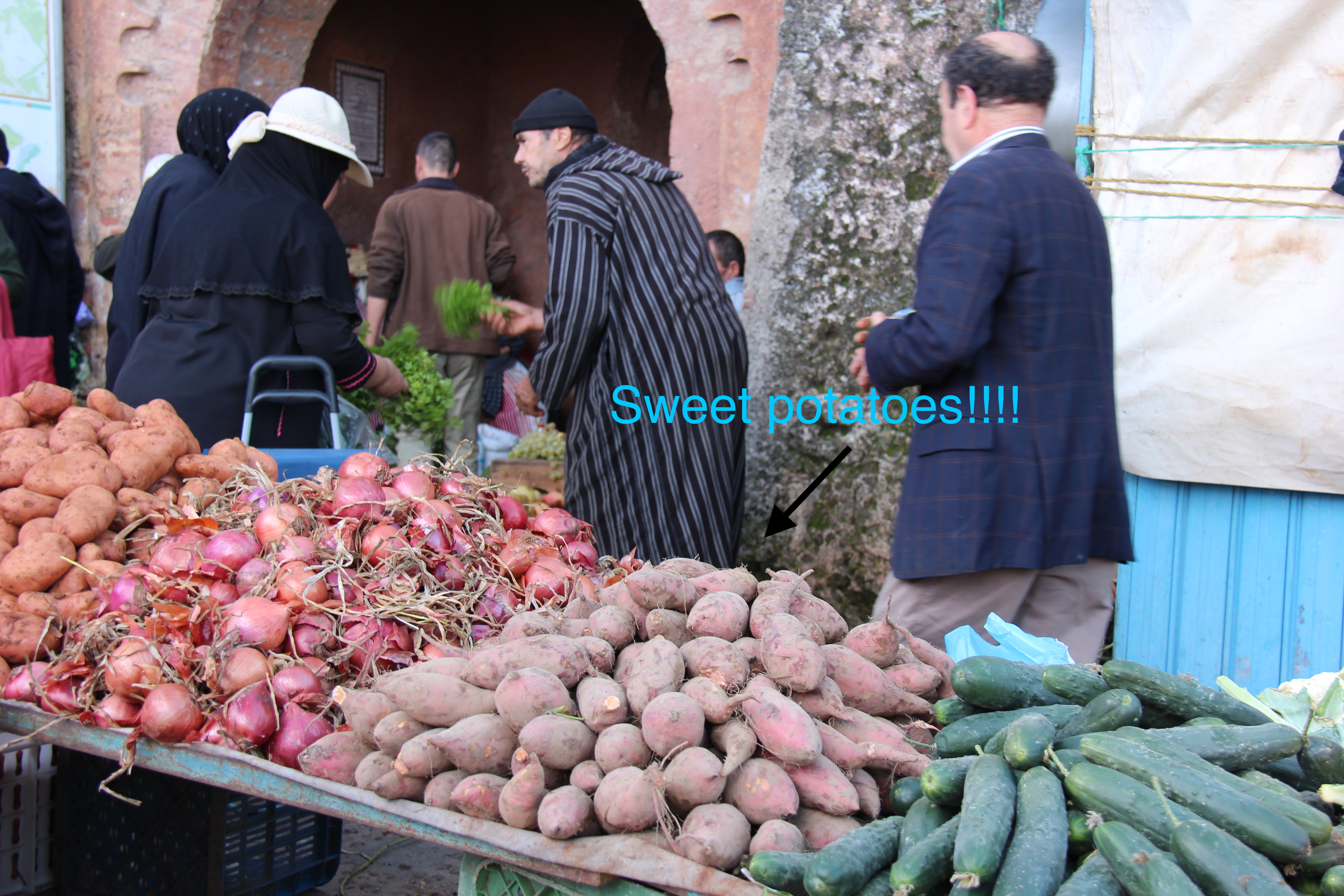 We were lucky enough to be there on a Thursday, one of two days a week the Berbers who live in the mountains come down to sell their produce in Chefchaouen. All the food they were selling looked so fresh, but I was most excited that they had sweet potatoes. More southern parts of Morocco sell what they call sweet potatoes, but they have starchy white flesh. Orange-fleshed sweet taters are normally a big part of my diet, so I’ve been missing them since arriving in Morocco. I bought an armload.