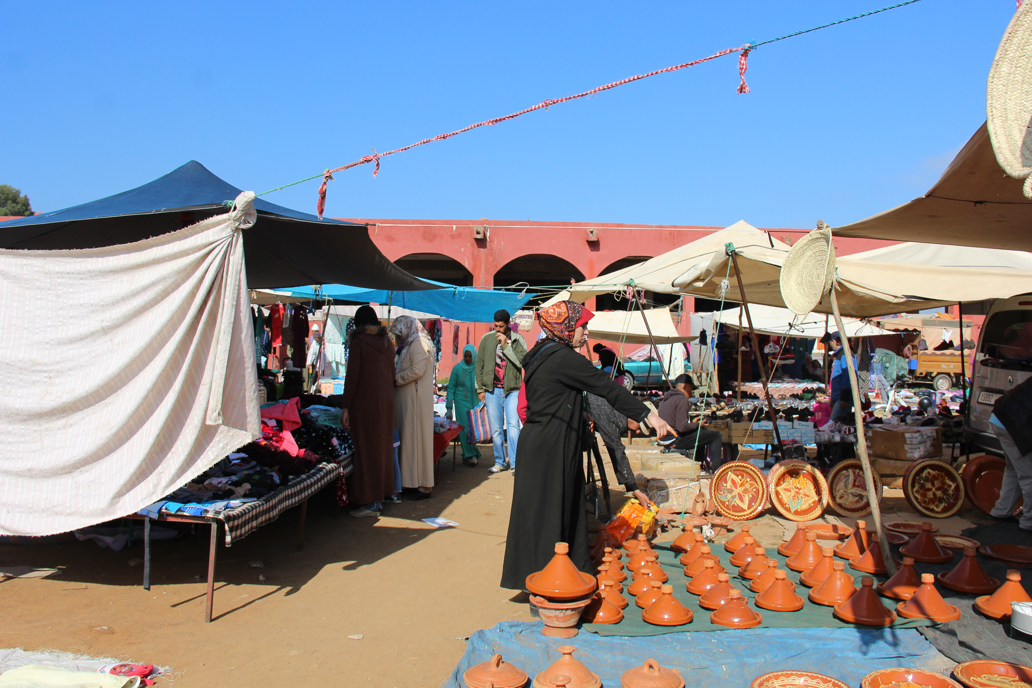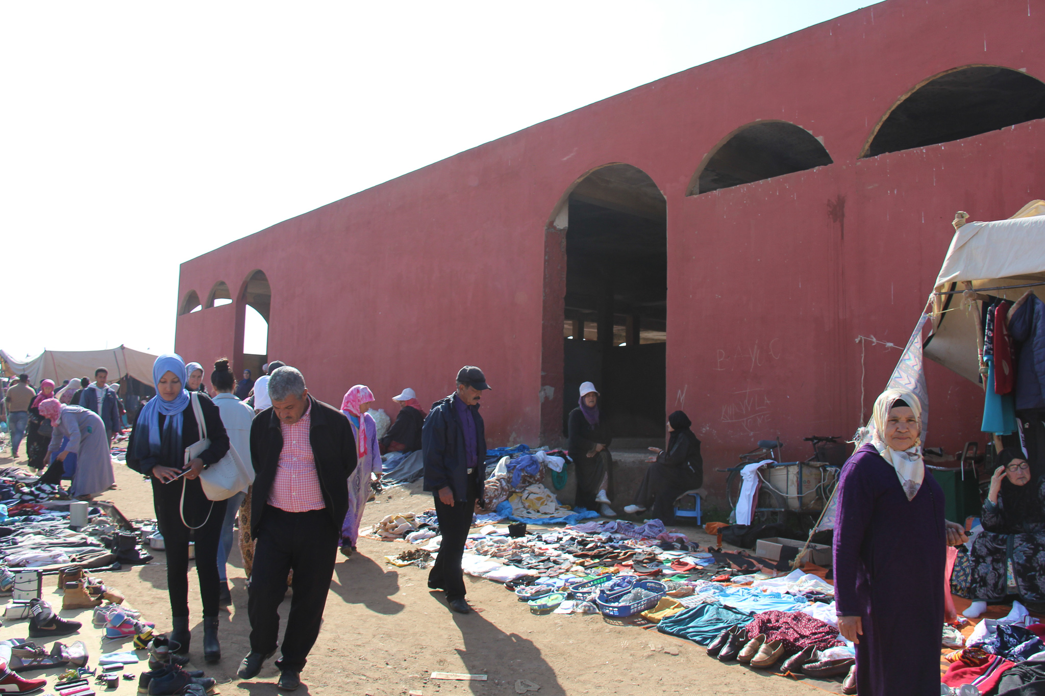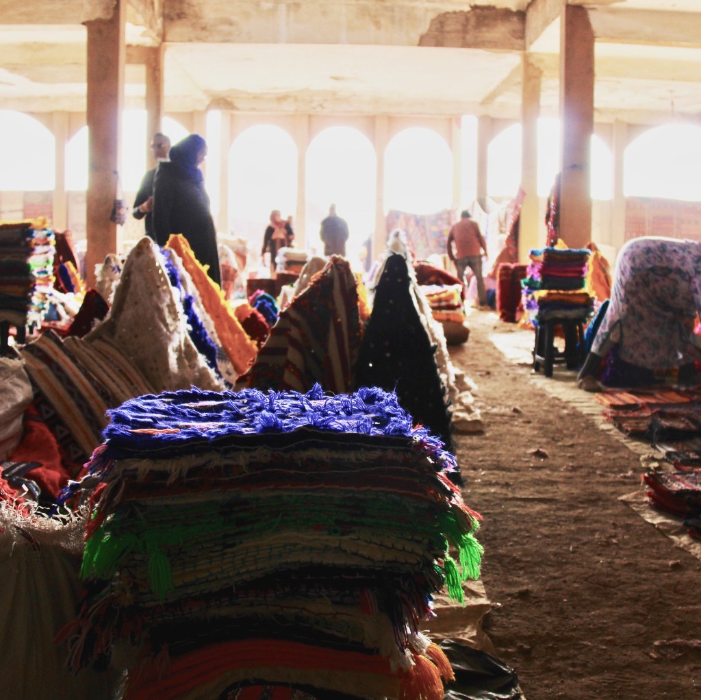 But this post is about a truly unique rug-buying experience: The every-Tuesday Khemisset carpet market. Back when I first arrived in Morocco, my friend Tara got me truly excited about this place, mostly from her lovely blog post on it. Every Tuesday, from about 7am to 11am, year round, Berber women set up their carpets in big open-air concrete structure in the town of Khemisset, which is less than an hour-and-a-half drive from both Rabat and Fez. Another friend (who scored three carpets from Khemisset for shockingly low prices) told me I must arrive before sunrise but because still-dark mornings make me legit physically ill, I did not oblige that advice. Instead my friend Krista and I arrived around 8:30am on a Tuesday morning back in March. (Krista is an amazing photographer and world traveler and you should do yourself a favor and follow her on Instagram @kristarossow.) Finding the market was not difficult; I just typed “Khemisset” into Waze and then followed the crowd of pedestrians, cars, and horse-drawn carts to the market. Outside the carpet market is a huge flea market that has been going on every Tuesday likely for hundreds of years. If you’re lost, ask any one of the many policemen or a local to point your toward “les tapis” or “souk Zrabi.” Park wherever you can and look for the red concrete structure. That’s where the carpets are.