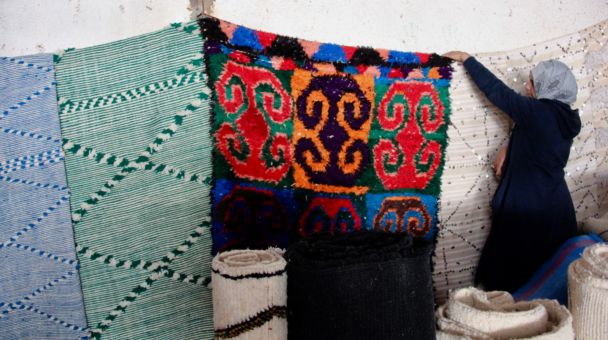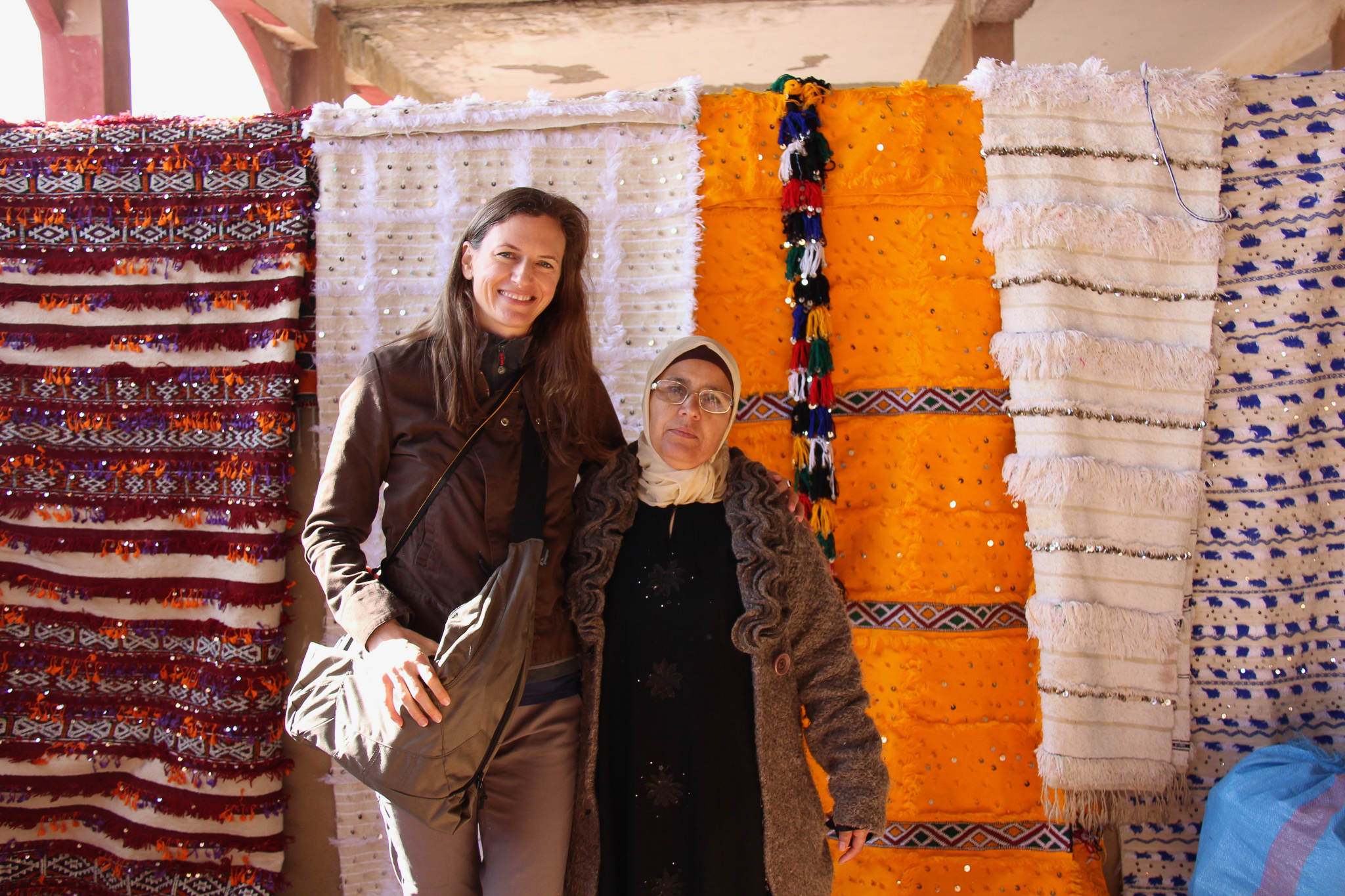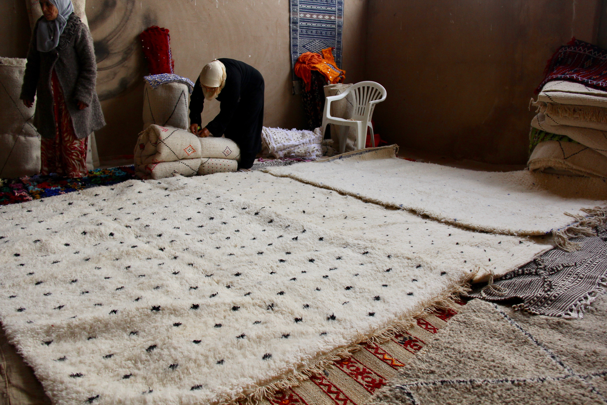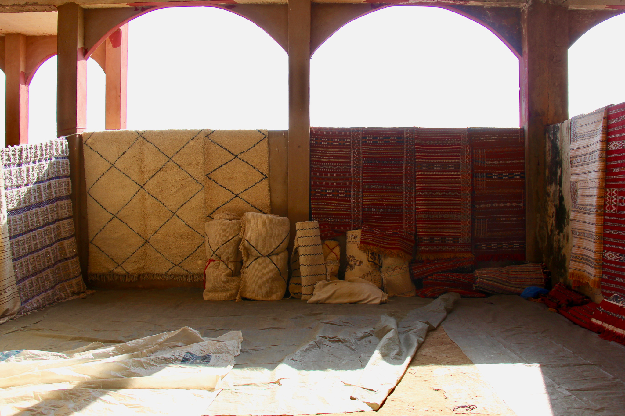 We didn’t have much purchasing power as just two ladies buying at most a few rugs each. I tried to explain to some of the women that I lived in Morocco, which usually gets me discount, but we soon realized there wasn’t going to be any shared language here. The women speak Berber. I could muster a few words of both Arabic and French, but they mostly didn’t land. When we asked prices, more often that not, the rug maker would ask to see all our cash and we’d hand over our dirhams and she’d count from our wad to indicate how much she wanted for each rug. I don’t recommend the “Here’s all the cash I have and now please make up a price” method of haggling; it doesn’t work in the buyer’s favor. Sometimes there’d be a younger man or woman around that could help with the negotiation, usually speaking some French and/or English and armed with a calculator and we’d go back and forth typing in digits to represent in dirhams what we’re willing to pay.