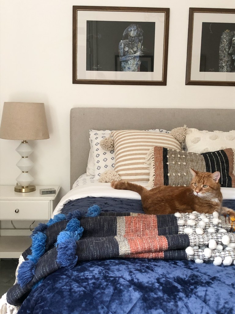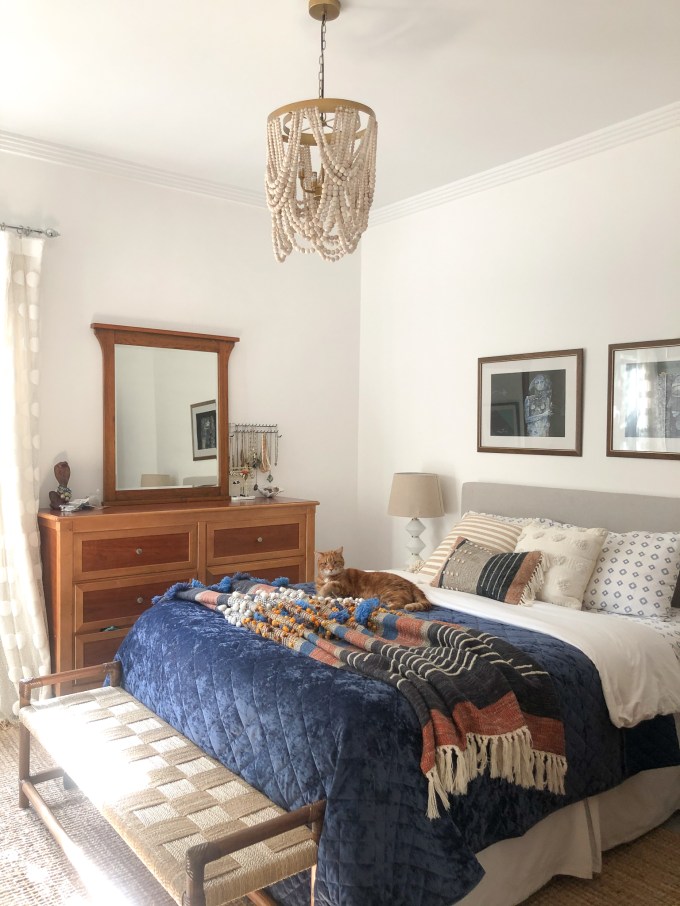 For bedding, I really love just plain crisp white sheets and a simple duvet. In theory. This is what I love about nice hotels – how clean and crisp the sheets and duvet cover are – and I love this in home design photo spreads. In practice, the white bedding felt whatever the opposite of extra is. So I got a blue velvet quilt from Target, at the recommendation of my design icon Emily Henderson, and the rich blue added some needed depth – in both color and texture – to the bedding situation. I’m still in love with my Moroccan-looking throw blanket, that is actually from Anthropologie. The jute rug gives in a natural, beachy feel and so does the World Market wooden beaded light fixture, and the wooden bench I had custom made in Morocco. Those Ikea drapes date back to my DC apartment, but I still like how pretty and playful they are. So below is the picture of how our room was up until a few weeks ago. Over the bed are two paintings Adam bought in Yemen by the artist Mazher Nizar and we still wanted them to be in the room. They add a little darkness to an otherwise very light room. Also, we love them.
