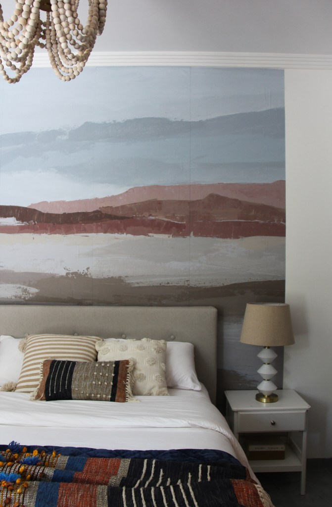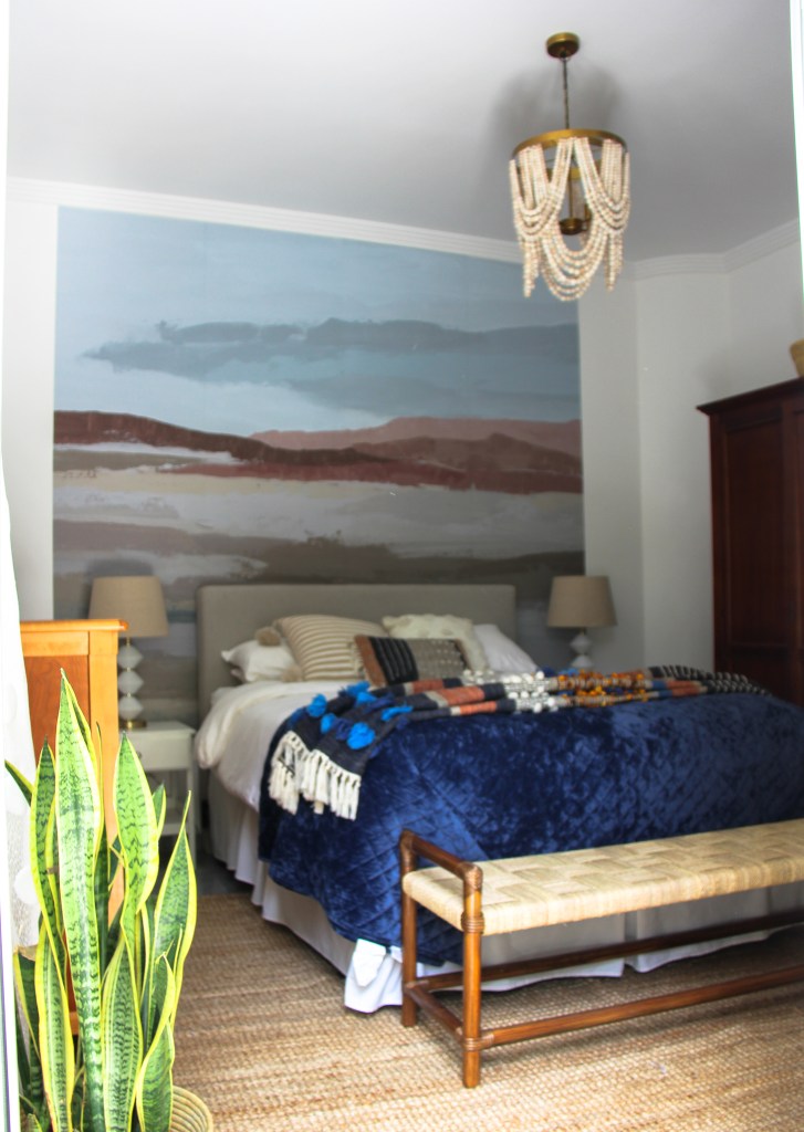 But even after the bedding, the chandelier, the jute rug, the bench, I still felt the room was lacking something. This is probably because I am historically not a fan of white walls. I considered painting them, but figured a pale pink would be too feminine for a room I share with a man, pale blue would be too nursery, beige would be too beige. It was sometime at the beginning of quarantine that I got the idea in my head for a wall mural above the bed. Some online searching brought me to the Blushing Expanse mural based on a painting by Texas-based artist Kati Ramer, sold by Minted. It captured the feeling of what I wanted in the room: beachy, but not the piña colada and sweaty cleavage and hot-sand-in-your-picnic kind of beachy. A clean, slightly moody beach, at dusk perhaps, maybe when a storm is a few hours away. Not too hot. This mural was the perfect way to bring in all the colors already – blue, cream, beige, mauve and pale pink – and really draw attention to them.