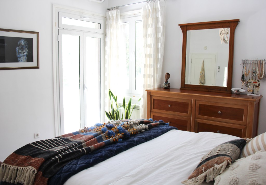 So, our master bedroom. I knew I wanted something light, clean, and serene. This is not my normal aesthetic. I’ve tried for a light, somewhat minimalist bedroom once before, in Madrid, when I painted our bedroom walls mint green and had very neutral bedding. It lacked oomph. I tried again here in Algiers.