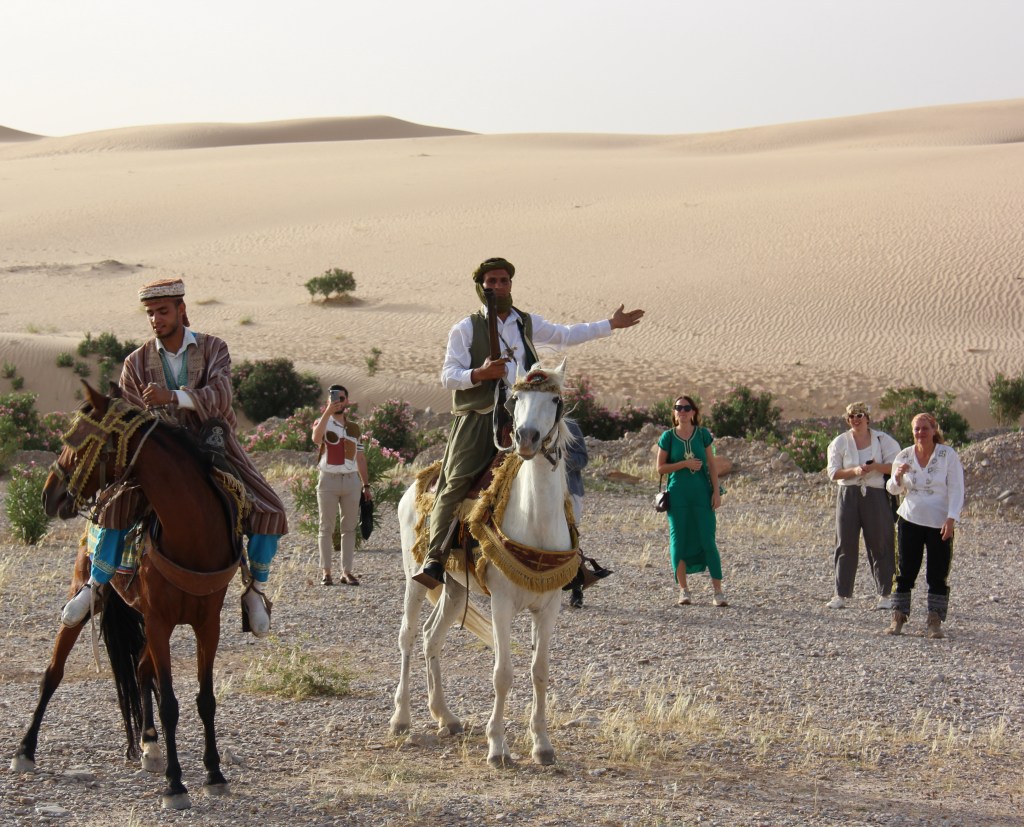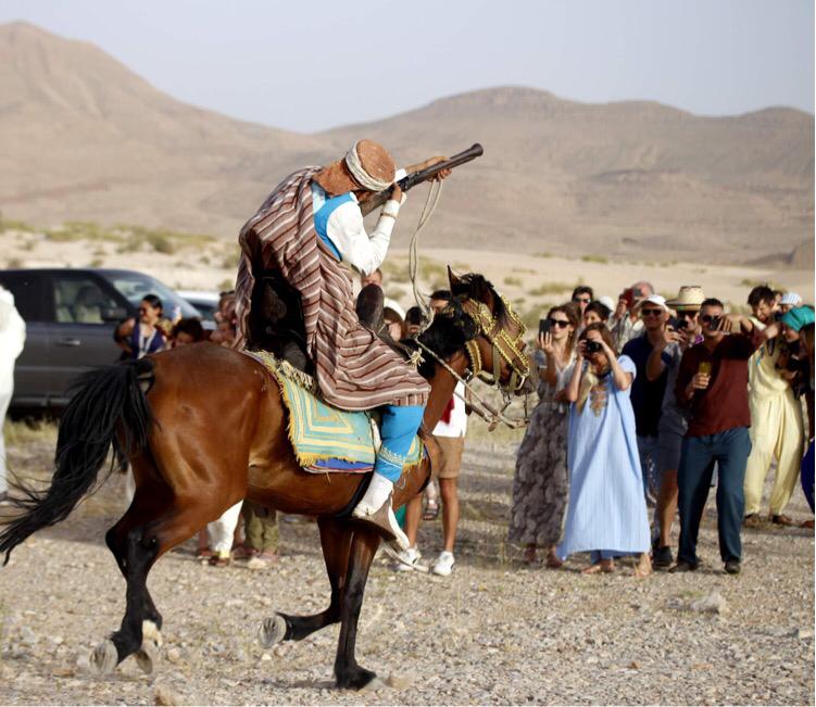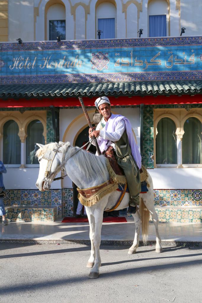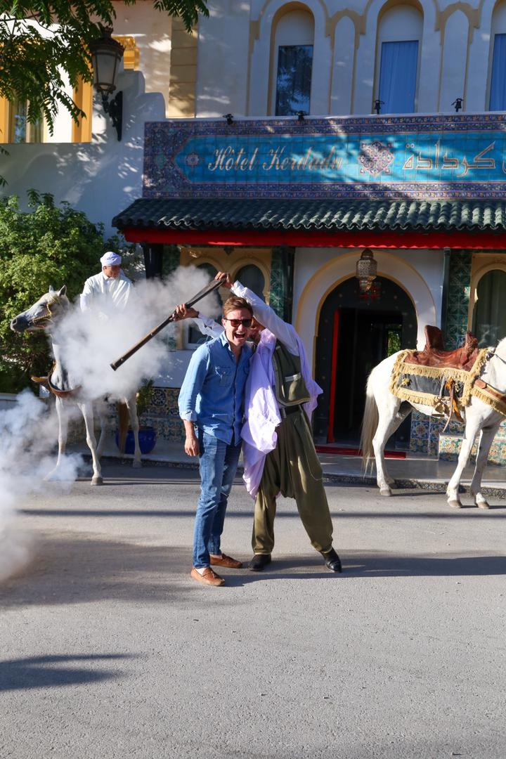 But when our multi-car caravan pulled up in front of our hotel – a pretty tile-front structure in the middle of dusty but kind of charming street – there were two gunmen on horseback giving us what I learned was a traditional Bou Saada welcome: Deafening firing of blanks. Nothing says “rest your feet here, oh weary traveler” like trying to find parking and pulling in your suitcase amidst dusty air and frantic horses and painfully loud gunshots, but also wanting to take photos of this spectacle.