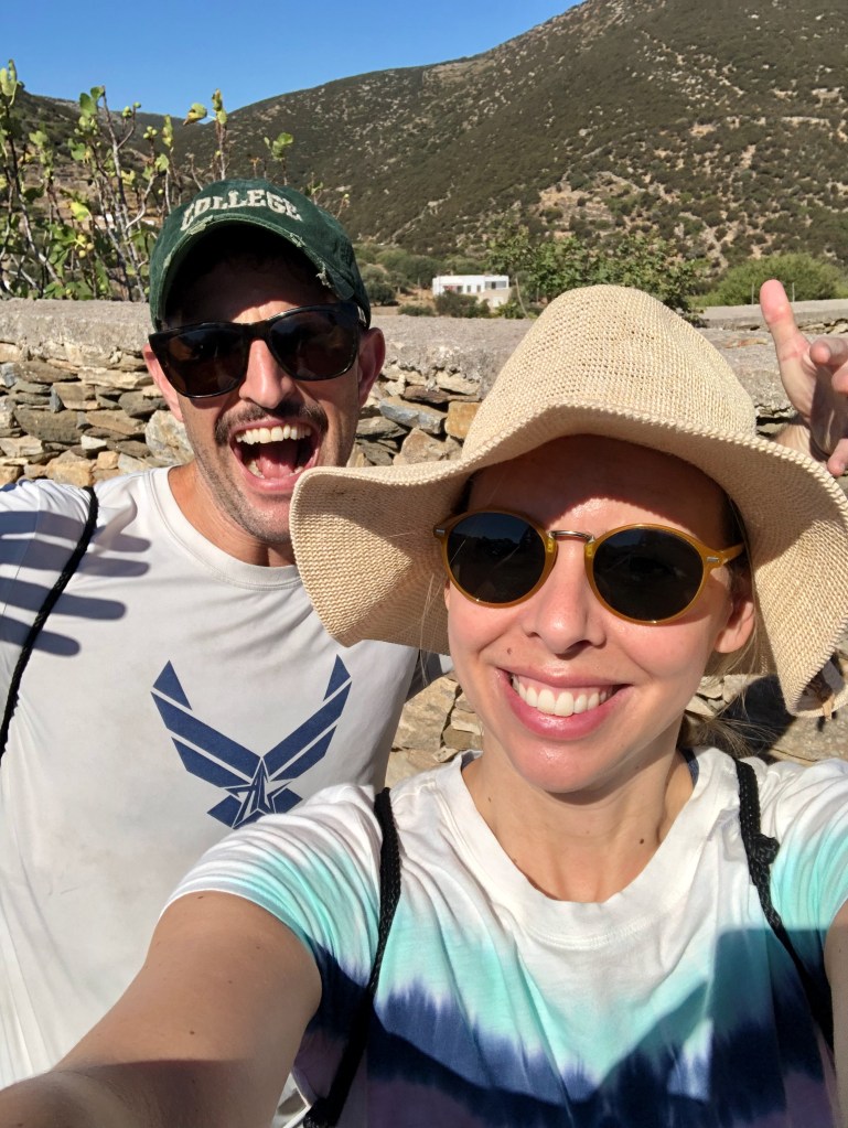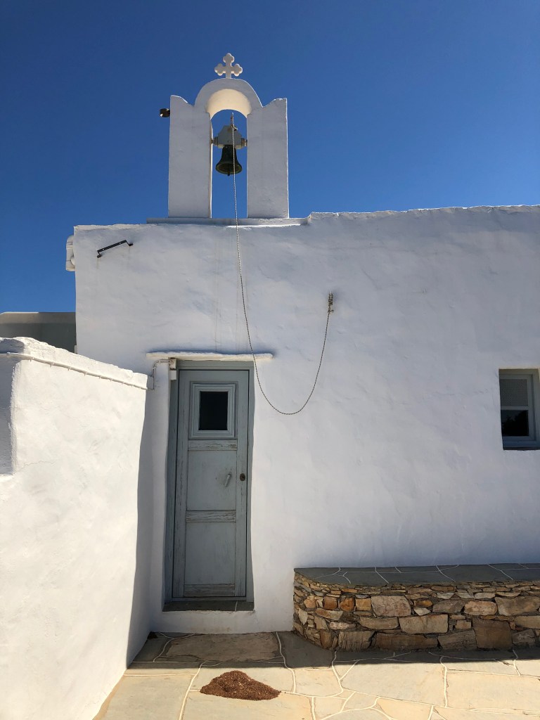 And for the most challenging hike of the trip, the three of us hiked a hillier, rockier part of the island that ended at the Panagia Poulati monastery, which is only accessible by foot. I did nearly 28,000 steps that day! So we certainly earned the fried cheese, tzatziki, zucchini balls, and beers we tucked in to at Maragarita in Artemonas afterward. (Unlike the previous days, this taverna is in an adorable town square, rather than on beach).