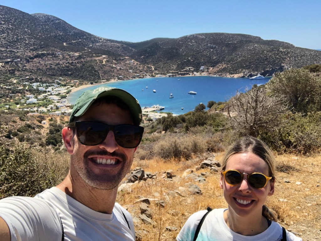 That evening our friend Sarah arrived from Paris and she joined our hiking club. (And slept in a bed next to us in our hotel room, but it was cozy). The following day, we hiked from Apollonia to Platis Gialos, which is one of the more happening spots on the island, and the town where THE island hot spot, the restaurant Omega 3, is located. We hoped we could just saunter up to Omega 3 post-hike and procure a table for the three of us hikers, and the six-person Dutch contingency. The hike was awesome, but the Omega 3 folks informed us that they were booked solid for lunch and dinner through October and we had no chance. Of course when I told this to our Dutch friend Daniel, who has FOMO and is very persuasive, he marched back over and somehow secured us a dinner reservation for nine people for our last night on Sifnos. Anyways, we ate a still very delicious lunch at less famous restaurant and it was just fine. More than fine, really. Even though the menus on Sifnos aren’t large – grilled squid, shrimp, meatballs, dips, cheese, zucchini balls, salads — they are SO GOOD. (I could do a whole other post on how the thing I miss the most is big good salads. But I’ve already picked the hiking thing, so I’m sticking with it).