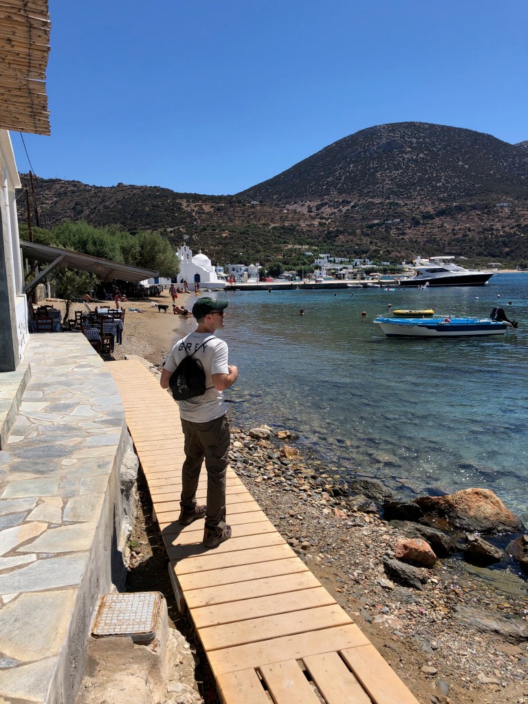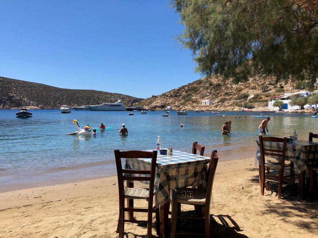 The following morning, we knew what our first hike would be: The one we got so, so lost on the previous year! We started walking through the streets on the adorable village of Apollonia (we stayed nearby to Apollonia) and then up into the mountains. On very clearly marked paths. So either were were oblivious dummies in 2020, or the island of Sifnos invested in better marking their many trails in the previous year. I like to think the head of the Sifnos tourism board read my blog post and got to work. The hike was a pure delight. The freedom of getting exercise in the open air and having no Algerian police tailing us! We arrived to Vathay Beach, our destination. The hike ended literally on a boardwalk right on the beach. And the beach was small, scenic, serene, and had a spattering of tavernas. We chose one called To Tisikali and we positively rejoiced in ice cold beers, refreshing tzatziki, zucchini balls, and grilled squid. Then, we swam.