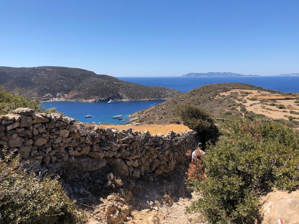 The following day, it was time for another freedom-embracing hike!!! This one we walked from our hotel in Apollonia to Chrisopigi beach. We went through old agricultural areas, past lots of stone fences, past a music school where kids were playing the guitar, up into rolling hills where we saw horses, cows, and donkeys and where the stunning mountaintop village of Kastro was visible in the distance. The end of this hike is truly spectacular, because you walk from the town of Faros, on a (short) manmade trail up a mountain to connect to Chrisopigi beach. The view is wonderful, from atop the cliff, looking down at the bay. After this hike, we met our friends at Apokofto Tavern, one of the best tavernas on the island.