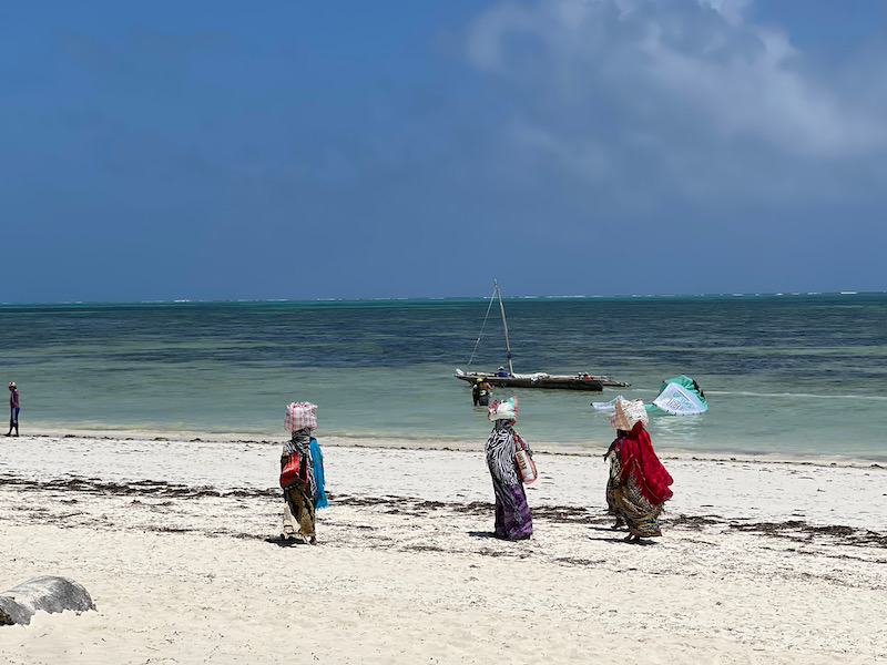 Each day fell into a nice routine of wake up, coffee, yoga, breakfast with lots of delicious fruits, reading, walks on the beach, fish or squid for lunch at a beach shack restaurant, nap, reading or writing, possibly another yoga class, piña colada, dinner, and the deep sleep of being on vacation with no cats sleeping in your bed. Adam tried his hand at kite surfing, and while he was doing that, I would go for a walk along the beach. The ocean has this crazy tidal system that means the coastline virtually disappears at some parts of the day and Zanzabarian women use the low tide to dig holes and plant sea grass, which will grow tall enough after a few weeks to be used in weaving mats and baskets. Then, they walk down the beaches with baskets balanced on their heads.
