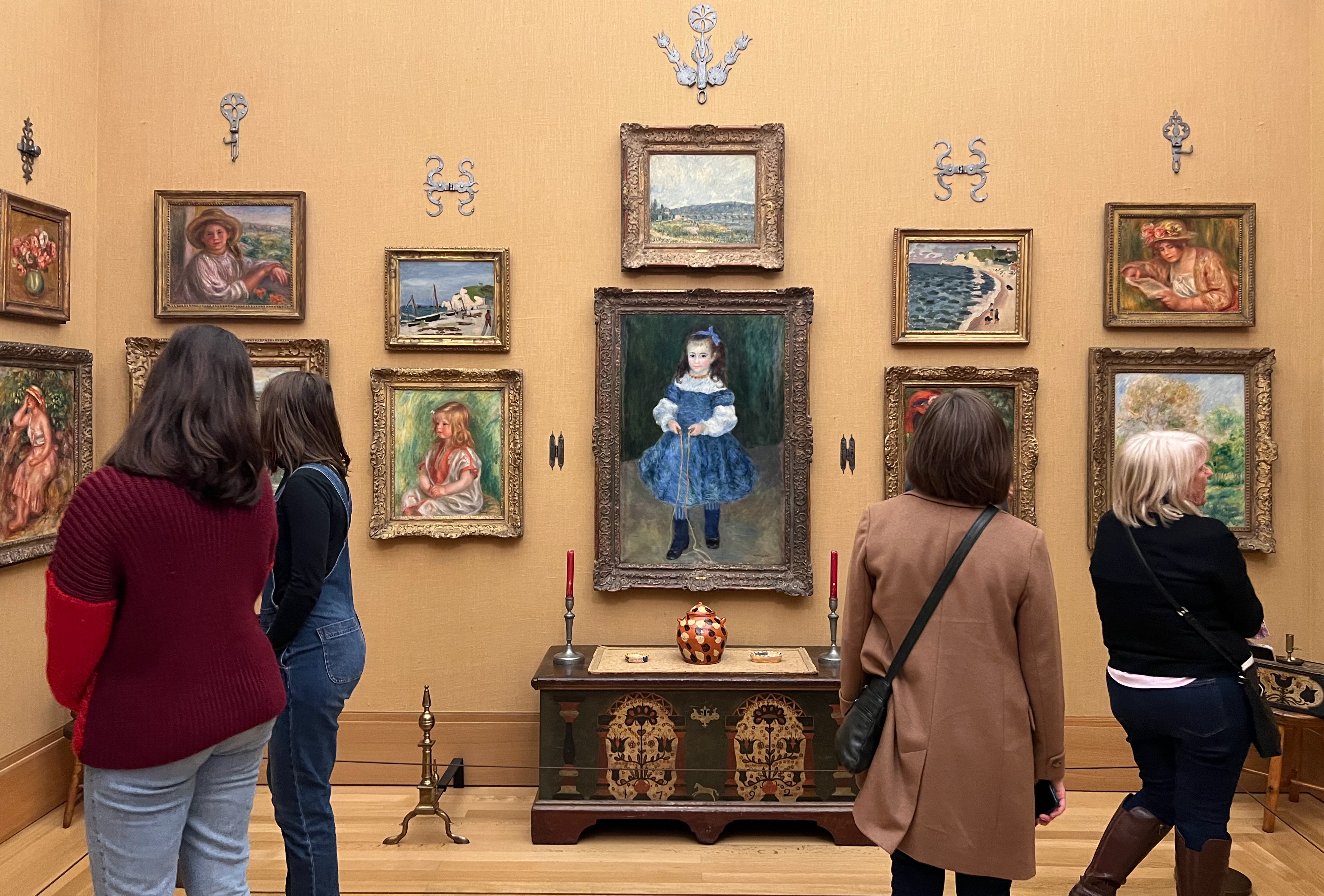 During our visit, we had a guided tour which I recommend because there are no placards describing the works, because Barnes believed museums should not be didactic, rather, the viewer should take in the work in relation to other works. Comparing and contrasting as way to absorb meaning from the piece, rather than having a narrative or information about the artists’ life color the viewers perception. In one room, there is an east African sculpture with an elongated face, and our guide pointed to a Modigliani painting right above it with its elongated face, and it was so clear that Modigliani was influenced by African masks. Same for African masks with hollow eyes and blocky triangle noses and a Picasso painting with those same features. Barnes would have asked why we call the makers of the masks artisans yet we call the European painters artists.