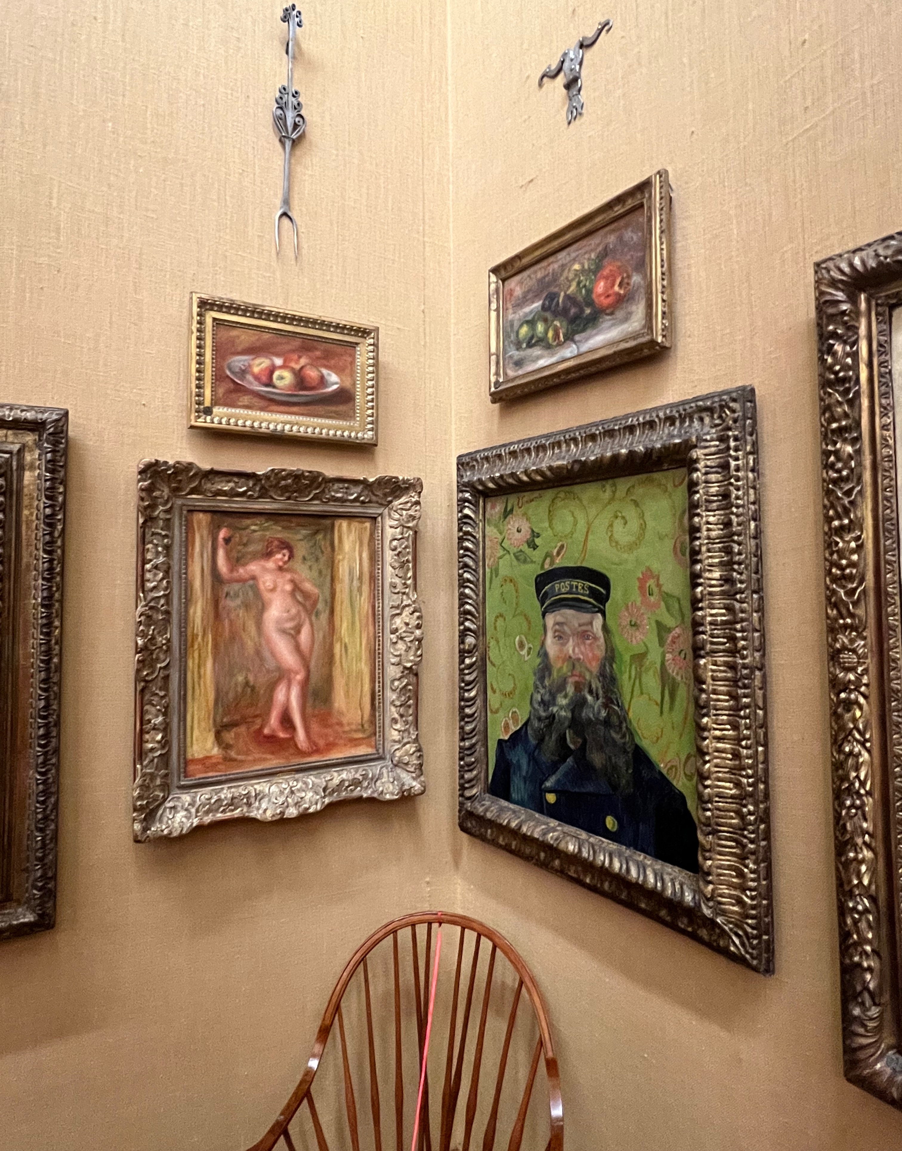 A number of things about Barnes were unusual for the time, including that he employed Black people at his Argyrol factory and that he displayed art from African Americans and Africans alongside European masterworks. Also unique: his belief that people from all walks of life would greatly benefit from engaging with art. For a time his massive collction (then housed in his estate a few miles outside of Philly) was only open to students and workers. It wasn’t until 1923 that there was a public showing of Barnes’ collection. He also believed one should look at art in comparison and contrast to other works of art. Those other works of art could be other paintings, metalworks, African masks, Native American jewelry. So he meticulously arranged priceless works next to then unknown works. This means a Picasso may catch your eye up at the top of a grouping and that one of the collection’s most famous works, Van Gogh’s The Postman, is hung in a corner, flanked by other oil paintings and topped by small metal sculptures.