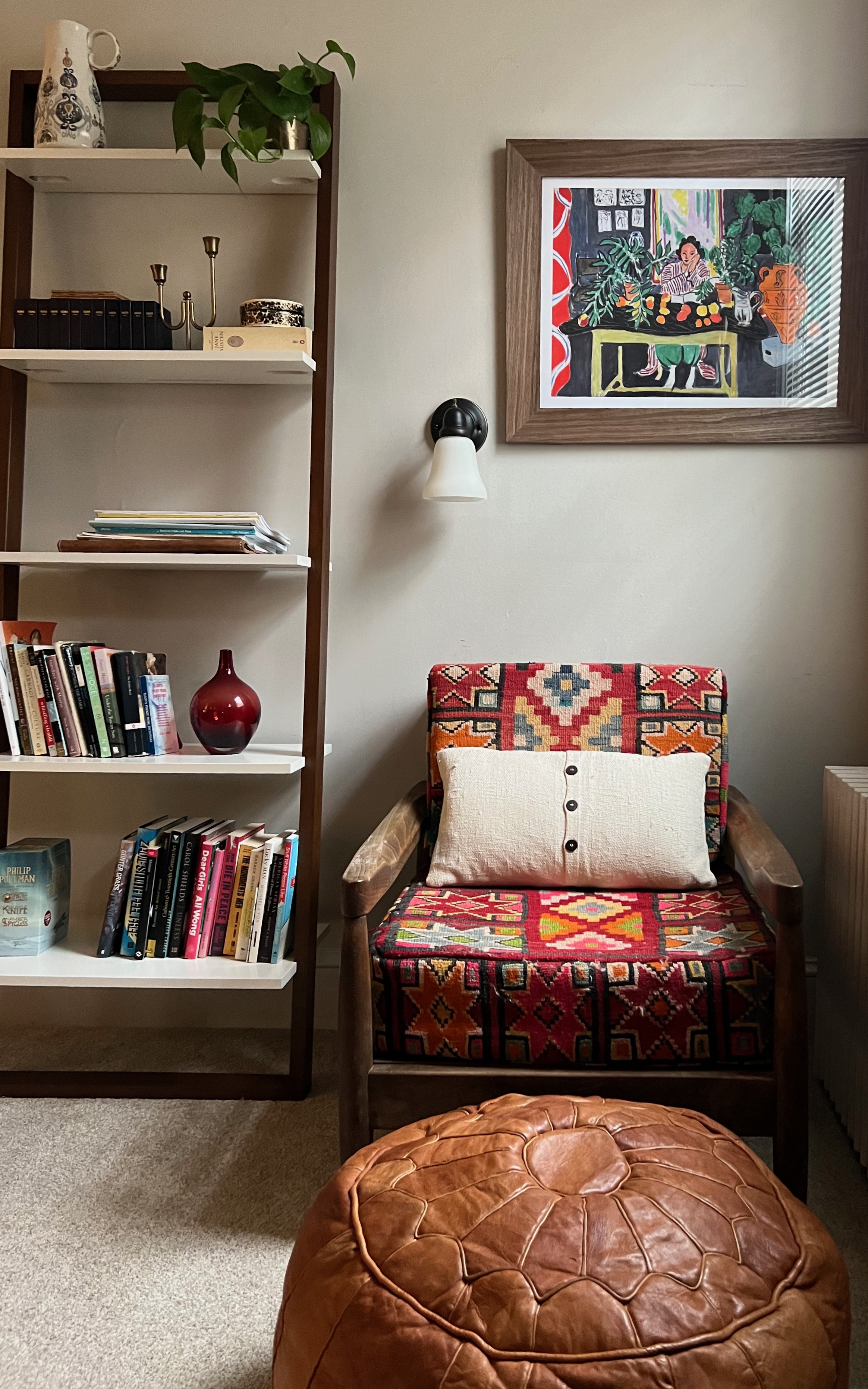 Earlier this month, Adam and visited Philadelphia to catch the final days of a Matisse exhibit at the Philadelphia Museum of Art. And it was very good, especially seeing all of the what I call “women seated in fabulously colorful chairs.” Mark my words, one day I will design a room inspired by a Matisse painting. I brought a print home with me, tried to get it professionally framed, realized framing in America is super duper expensive, and put it in an off-the-shelf frame from Michaels. It’s hanging above a chair I brought from Algeria and adds some color to an otherwise monochrome living room in our Princeton rental.