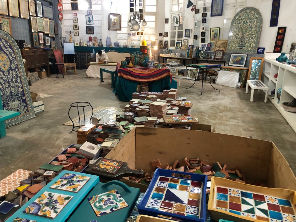 My favorite boutique – great for modern clothing made by Algerian designers, small home decor items, and jewelry is Boho Concept Store, owned by Lila.  Medina Mood is also very nicely curated, but expensive. Handmade Art DZ always has cute and colorful things, as does Le Dwira Chic. YK Interiors, which is owned by designer Karima, just opened a new location and is chic and totally infused with Algerian style (great fabrics in her designs). I actually ordered a custom sofa from Karima during COVID times and it’s very unique. The famed Boumehdhi family make the most beautiful handmade tiles and ceramics, a visit to their atelier is a must. The best place to buy smaller handmade things is at bazaars, either at embassies, the Sofitel, or sometimes at artisan events organized by the Algerian government. And although this isn’t in Algiers, I always enjoyed strolling on the main “shopping” street in Tipaza for art, small furniture, and rugs.